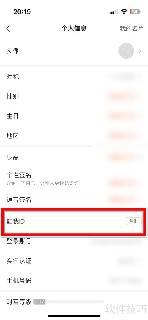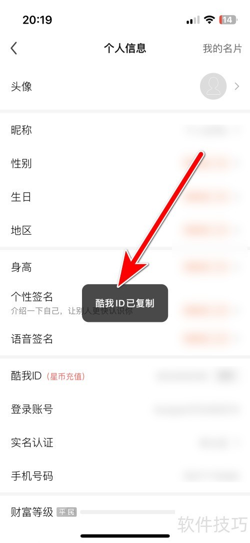 酷我聚星复制ID方法:打开个人主页,点击头像进入资料页,找到并长按ID即可复制。