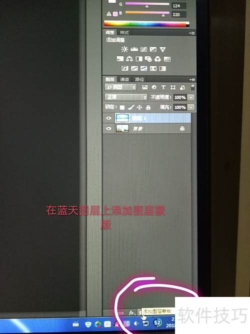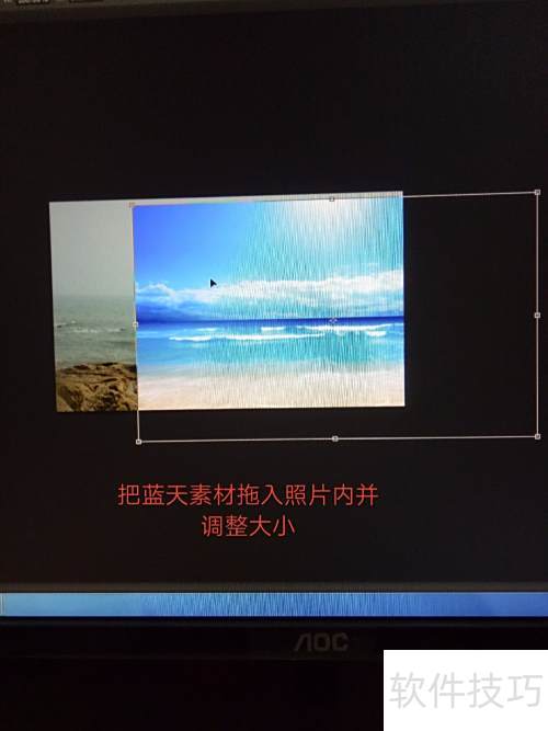 2、 将蓝天图片拖入照片中,调整大小与位置,创建蒙版后填充前景色为白色,再使用Ctrl+Delete用背景色填充,完成融合效果。