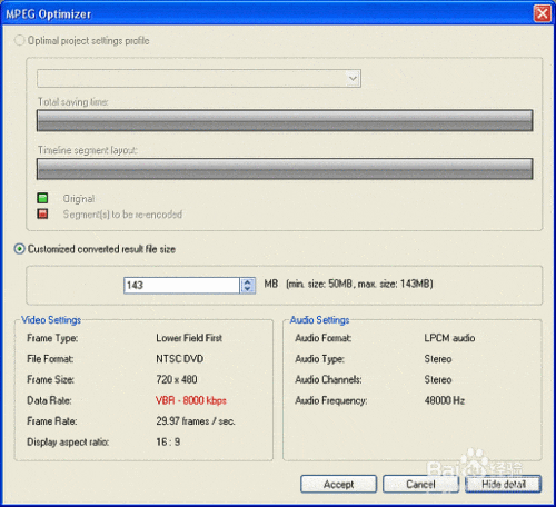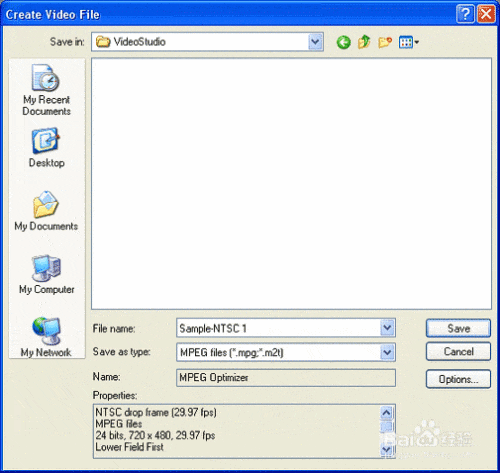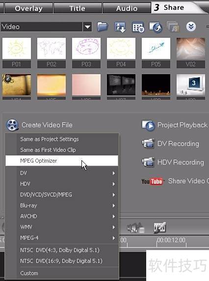 2、 点击共享选项,选择创建视频文件,然后选取MPEG 优化器选项,系统将弹出MPEG 优化器设置对话框。