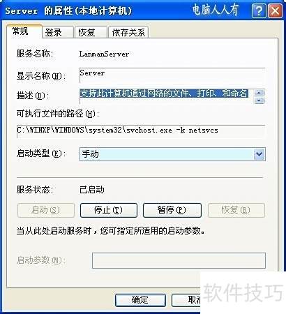 4、 启用网络共享需开启Server服务,该服务负责实现计算机通过网络进行文件、打印及命名管道共享功能。一旦服务停止,上述功能将无法使用;若服务被禁用,所有依赖它的相关服务也将无法正常启动,影响网络资源共享的正常使用。
