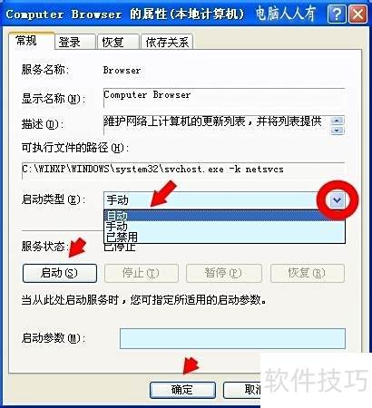 3、 请检查启动类型是否设为自动,若为手动,虽可初次使用,但后续可能需重新启动。进入Computer Browser服务属性,将启动类型设为自动或手动,点击应用,再启动并确认。