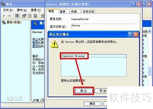 1、 关闭Server服务后,依赖它的Computer Browser服务也将停止运行(所示),系统将无法正常访问网络。
