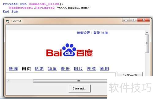 4、 在代码中输入WebBrowser1.Navigate2 www.baidu.com,随后点击运行按钮,即可查看页面加载效果,具体界面所示。
