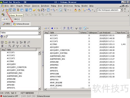 1、 启动Toad并连接数据库后,点击工具栏中的Schema Browser按钮,即可打开对应的浏览窗口。
