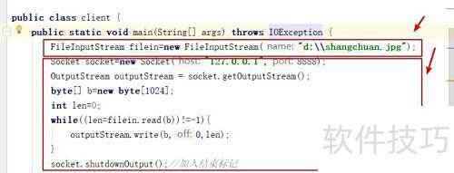 3、 在客户端类中,先建立本地文件输入流以读取文件内容,再创建Socket对象,通过网络字节输出流将文件数据发送至服务器,实现文件传输请求。