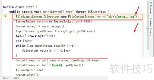 4、 在服务器类中实例化ServerSocket对象,通过其getInputStream()方法获取客户端发送的文件数据流;同时创建本地文件输出流,将接收到的数据写入指定路径,实现文件在服务器端的存储与保存。