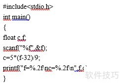 20、 将第4行代码恢复为5*(f-32)/9,并将第2行修改为float c,f; 之后,为确保程序能正确输出结果,第5行的输出语句也需相应调整,应使用合适的格式符分别输出华氏度和对应的摄氏度值,确保数据类型与变量匹配,最终准确显示转换结果。