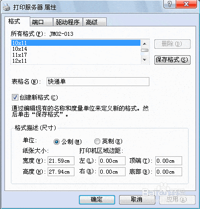 3、 自定义纸张时,先测量实际纸张尺寸。进入打印服务器属性,选择创建新格式表单,在表单名称栏输入自定义名称,随后在纸张大小中准确填写宽度与高度。注意:80列打印机的宽度不得超过539.75像素。设置完成后,点击保存格式表单即可完成配置。