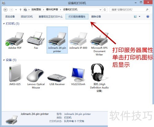 2、 在Windows 2000/XP系统中,依次点击开始菜单、控制面板、打印机和传真,进入后选择文件菜单下的服务器属性。对于Windows 7、8及8.1系统,进入控制面板后选择硬件和声音,点击查看设备和打印机,然后左键选中打印机图标,接着在顶部菜单中选择打印服务器属性即可进行相关设置与管理。
