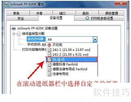 6、 在设备设置的滚动进纸栏选择已定义纸张,点击应用或确定即可。