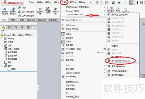 6、 在SOLIDWORKS菜单栏中点击工具,然后从下拉列表里选择SOLIDWORKS CAM选项。