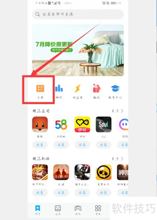 5、 ,打开软件商城首页,选择并点击分类栏目进入。