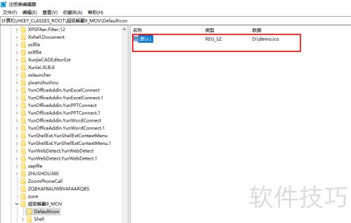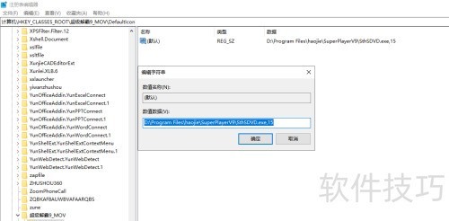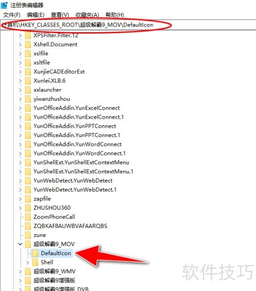 4、 依次展开注册表中HKEY_CLASSES_ROOT下的超级解霸9_MOV项及其DefaultIcon子项的树形节点。