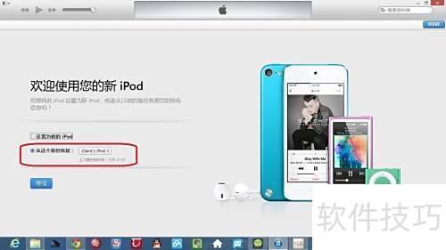 6、 恢复完成后,iTunes将弹出提示,告知设备已恢复出厂设置,数秒后进入欢迎界面。此时请选择从备份恢复,iPod随即开始从备份中还原数据,整个过程将自动进行,直至完成。