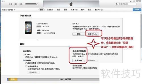 3、 进入设置页面后,若需保留iPod原有数据,可先点击下方立即备份进行手动备份,或直接选择上方的恢复iPod。在恢复过程中,iTunes会弹出提示询问是否备份,此时选择是,系统将自动完成备份并继续恢复操作。相较而言,后者无需提前操作,更加省事便捷,适合希望简化流程的用户,整体过程流畅且不易遗漏重要数据。