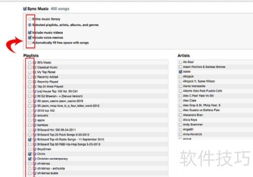 11、 选择需同步的内容。iTunes默认会同步资料库中的全部音乐。点击左侧栏的iPod设备,再点击顶部的音乐标签。勾选同步音乐,然后选择选定的播放列表、艺术家、专辑和类型,即可按需同步个人音乐内容。