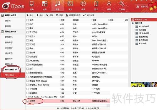 9、 导入完成后,小苹果将出现在itools音乐界面中iPod设备的音乐列表里。