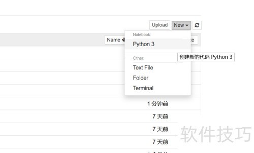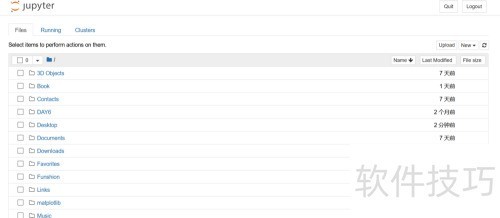 3、 打开Jupyter Notebook后进入主界面,可创建Python文件、文件夹等各类文档。