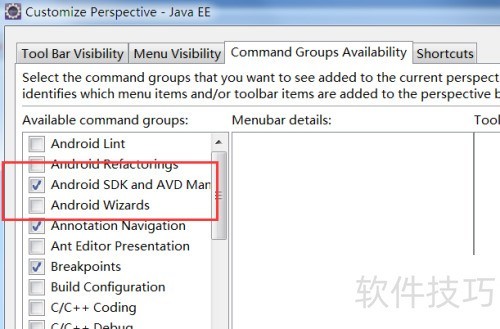 3、 在可用的命令组选项框左侧,勾选Android SDK 和 AVD 管理器选项,然后点击确定按钮。完成设置后,即可在工具栏中看到熟悉的 Android SDK 与 AVD 管理器图标,方便快速启动和管理模拟器及开发环境,提升操作效率,无需通过命令行繁琐调用,让开发流程更加顺畅便捷。