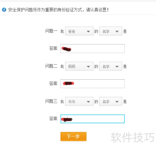 8、 选择对应的保护问题并填写答案,点击下一步,最后确认提交。