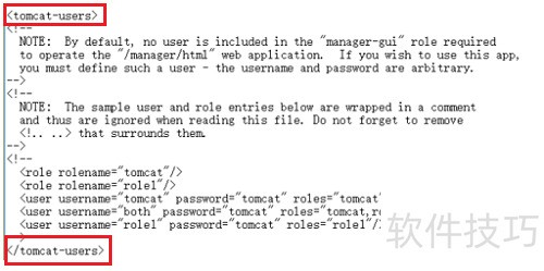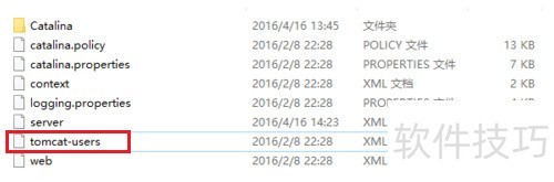 4、 进入Tomcat安装目录,打开conf文件夹中的tomcat-users.xml文件,使用记事本进行编辑。