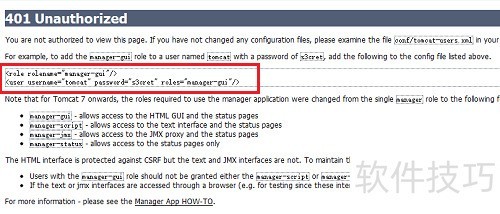 3、 访问Tomcat管理页面时,系统将提示进行身份验证。若点击取消,会显示添加管理员权限的提示信息。请注意弹窗中框出的两行说明,它指明了用户配置的格式要求。请按照所示内容复制并正确添加用户信息,以便获得管理权限。