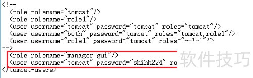 6、 将第二步复制的内容插入到与标签之间,随后根据实际需要调整用户名和密码。此处仅修改密码为shihh224,用户名及角色名保持不变。配置完成后保存文件,随后重启Tomcat服务器,使更改生效。确保操作过程中标签结构正确,避免语法错误影响服务启动。重启后即可使用新密码登录管理界面。