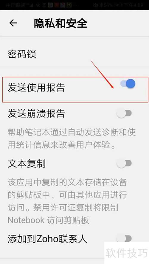 5、 进入隐私与安全设置,点击发送使用报告选项,操作所示。