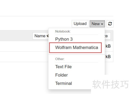 11、 在浏览器中打开Jupyter Notebook目录,点击New按钮,即可在下拉选项中找到Wolfram Mathematica。选择该选项新建一个Mathematica文件,便可直接编写并运行相应的代码,方便进行数学计算与数据分析。