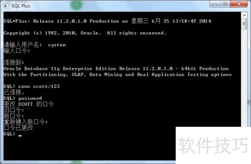 8、 修改口令的命令格式为:SQL>PASSW。若以特权用户身份登录,可修改指定用户的密码;若为普通用户(如SCOTT),则仅能修改自身的口令。