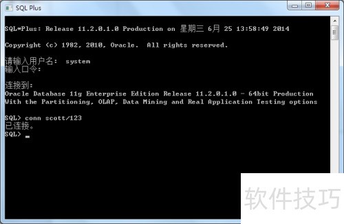 6、 切换用户连接的语法为:SQL>CONN 用户名/密码@数据库实例。
