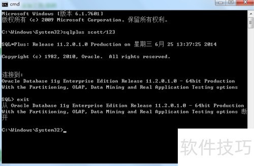 3、 使用EXIT命令可退出SQL*Plus环境。
