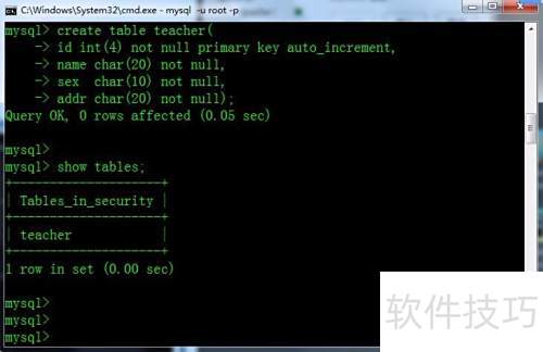 3、 创建教师信息表并查看数据库中所有数据表的名称。