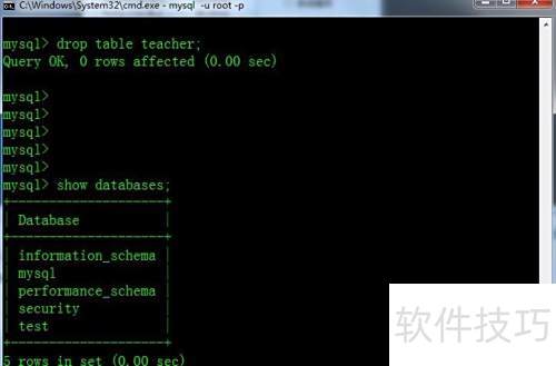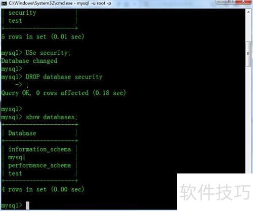 2、 通过 use 加数据库名可切换数据库,使用 drop database 加数据库名可删除数据库,以下以之前创建的 security 数据库为例进行操作演示。
