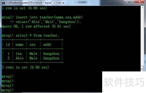4、 通过insert into teacher()values()语句可向教师表中添加数据,使用select * from teacher则可查询教师表中的全部信息。