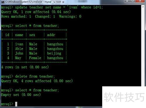 5、 更新数据表中id为1的记录,将第一列name的值修改为ivan,执行语句为update teacher set name = ivan where id=1;若要删除整张数据表中的数据,则使用delete from teacher命令完成操作。