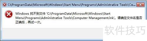 2、 系统提示无法找到路径中的文件C:ProgramDataMicrosoftWindowsStart MenuProgramsAdministrative ToolsComputer Management.lnk。请检查该文件的完整路径及名称是否准确无误,确认后重新尝试操作。可能原因是文件被误删、移动或路径拼写错误,建议通过系统搜索功能查找对应项目,或使用其他方式打开计算机管理工具。