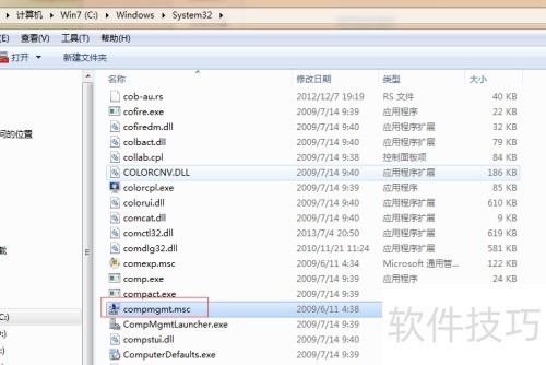 4、 进入C盘Windows文件夹下的System32目录,查找并定位compmgmt.msc文件。