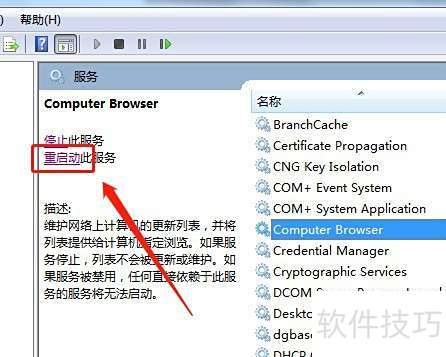 在win7系统中,通过服务管理器重启Computer Browser服务即可。