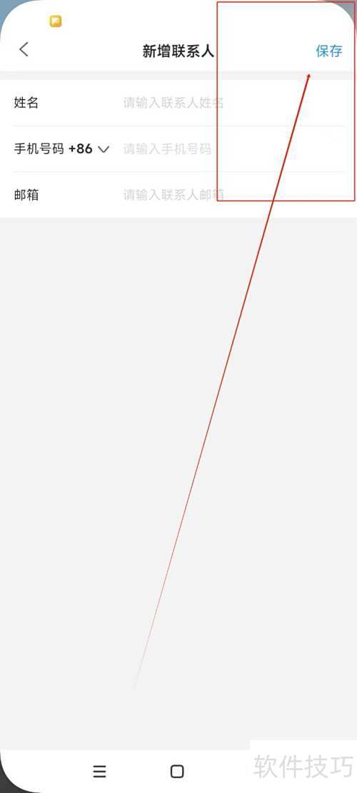 4、 在新页面填写姓名、电话和邮箱后,点击右上角保存按钮,即可成功添加联系人信息。