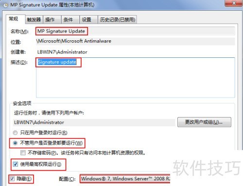 3、 在常规选项卡中,将名称设置为MP Signature Update,描述填写为Signature update。将用户或组更改为SYSTEM,勾选无论用户是否登录都要运行和使用最高权限运行选项,并启用隐藏功能。在配置部分,选择支持的操作系统为Windows 7和Windows Server 2008 R2,确保任务兼容指定系统环境,完成后保存设置。