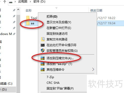 1、 选中aa文件夹,右键单击,从弹出菜单中选择添加到压缩文件即可。