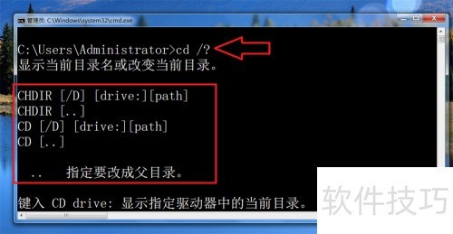 2、 在命令提示符中输入 cd /? 可查看该命令及其参数的详细用法说明。
