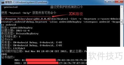 3、 例如,可通过命令行输入:keytool -list -v -keystore C:UsersAdministrator.androiddebug.keystore -alias androiddebugkey -storepass android -keypass android,执行后即可查看到对应的SHA1指纹信息。该操作常用于调试环境下获取Android应用的证书指纹,以便在开发过程中配置相关服务或验证身份。确保路径和参数准确无误,避免执行失败。
