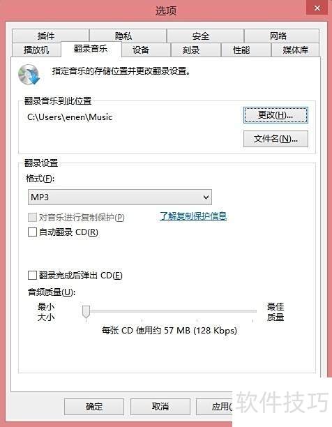 4、 点击更多选项进入设置界面,除已设定的格式与音质外,还包含自动翻录和翻录后弹出CD等功能,通常无需修改。界面顶部会显示翻录音乐的位置,指明生成的MP3文件保存路径,用户也可根据需要自行更改存储位置,方便管理翻录后的音频文件。