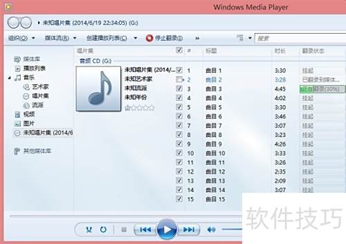 5、 接下来可选择需要翻录的文件,将15个曲目全部选中后,上方原本呈灰色的翻录CD选项将变为可操作状态。点击该按钮,系统将开始依次进行翻录。由于最初选择的是第二个曲目,因此翻录将从第二个曲目起始,具体过程可参考下图所示。