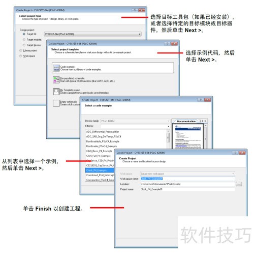 9、 根据新建项目向导的指引,选择并填写项目所需信息,该向导提供多种选项,可基于代码示例或预设的原理图快速创建项目。