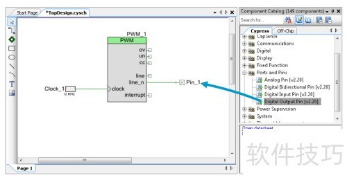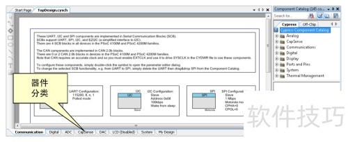 11、 可根据实际需求灵活调整设计方案,通过添加各类组件和功能实现个性化配置。针对PSoC 4xxx系列器件,系统已预设包含常用模块的原理图,各组件按功能类别分组显示,并设有我的设计选项卡便于自主定制。用户可选择关闭特定模块或整个分类标签,实现资源优化。通过在设计界面中直接拖拽组件库中的元素,如引脚、时钟信号及其他功能模块,即可便捷地完成电路搭建与功能扩展,满足多样化设计要求。