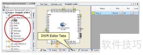 15、 双击资源管理器中的节点,可打开设计范围内的各类资源,如引脚、时钟、中断和DMA等,打开后可通过标签页在不同资源间切换操作。