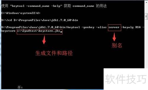 1、 首先,打开命令提示符窗口,并切换至JDK安装路径下的bin目录。接着输入命令 keytool -genkey -alias your_alias -keyalg RSA -keystore keystore.jks,然后按下回车执行。系统会提示你输入一系列信息,包括密钥库密码、姓名、组织单位、组织名称、所在城市、省份以及国家代码等,请根据实际情况填写。在设置密码时,建议将密钥库密码与密钥密码设为相同,避免后续使用中出现兼容性问题。若两者不一致,可能在启动服务器时遇到类似LifecycleException: Protocol handler initialization failed: java.io.IOException: Cannot recover key这样的错误提示,导致服务无法正常启动。该问题较为常见,根源就在于密码不匹配或密钥无法正确读取。为便于演示,图中原本应为server的别名已被替换为server2,因为本机已存在名为server的条目,为避免冲突而作此调整。整个过程完成后,将在当前目录生成一个名为keystore.jks的密钥库文件,该文件将用于后续的SSL配置或应用签名等操作,务必妥善保管。